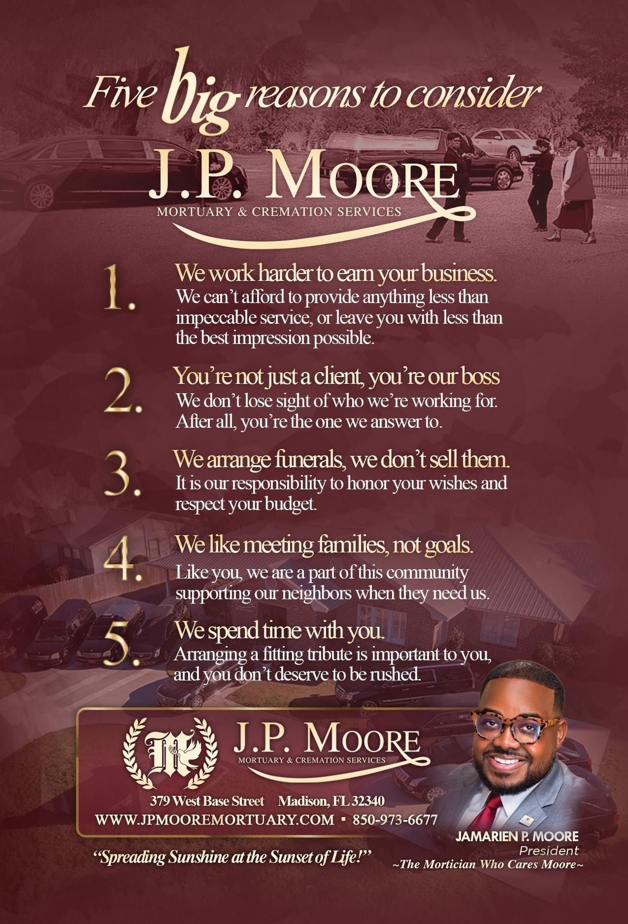 Our directors at J.P. Moore Mortuary & Cremation Services are here for you and your family 24/7. Please Contact Us anytime, for help with arrangements or discover what to do when someone passes.